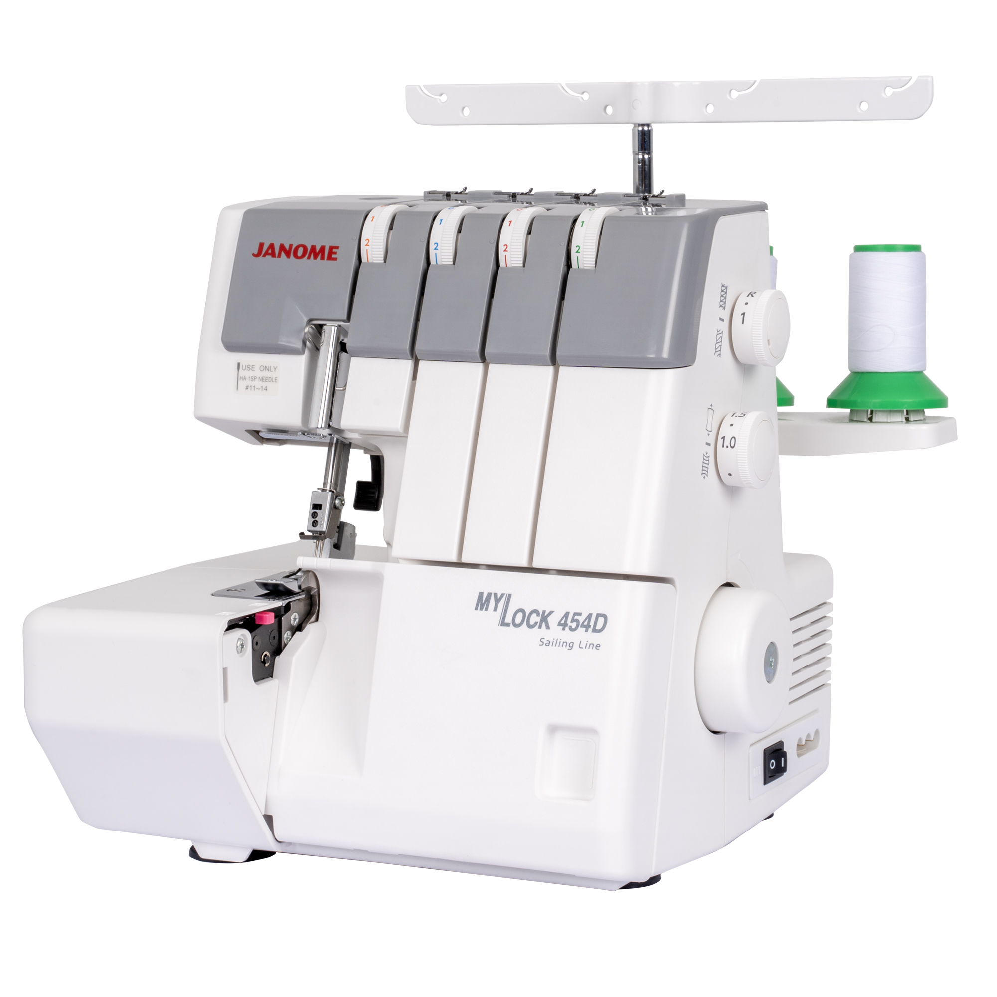 Introducing the MyLock 454D from Janome’s new SAILING LINE of sergers. This compact and user-friendly machine delivers professional-level sewing performance. Equipped with an enhanced feed system, including an 8-piece feed dog, a newly designed presser foot, an unobstructed view of the cutting knife, and improved bi-level performance, it can tackle a wide range of projects and fabrics. Threading is simplified with the Easy Threading Looper and slide-in pre-tensions. The improved motor torque and specialized Hanenite Rubber feet, designed to reduce vibration and noise, provide a Smooth Sailing sewing experience.